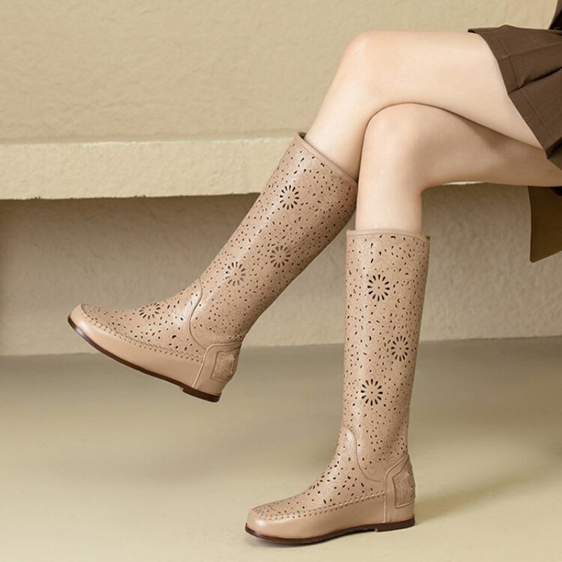 Mode Echtes Leder Ausgeschnitten Runde Zehe Niedriger Absatz Kniehohe Stiefel Mode Frühling Herbst Aprikosenfarbenes Rindsleder Damen Kurzstiefel Größe 43