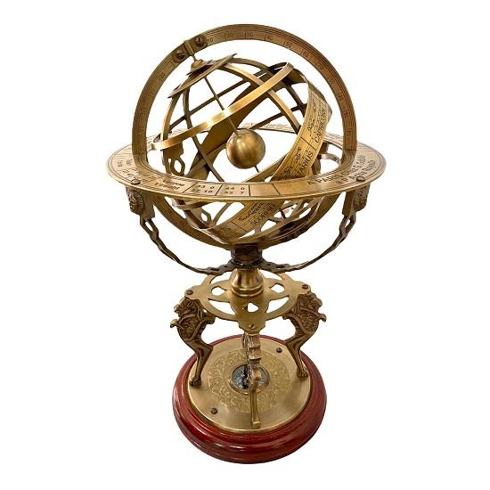 Armillar aus Messing & mit Holzsockel | Braunes Antik-Finish