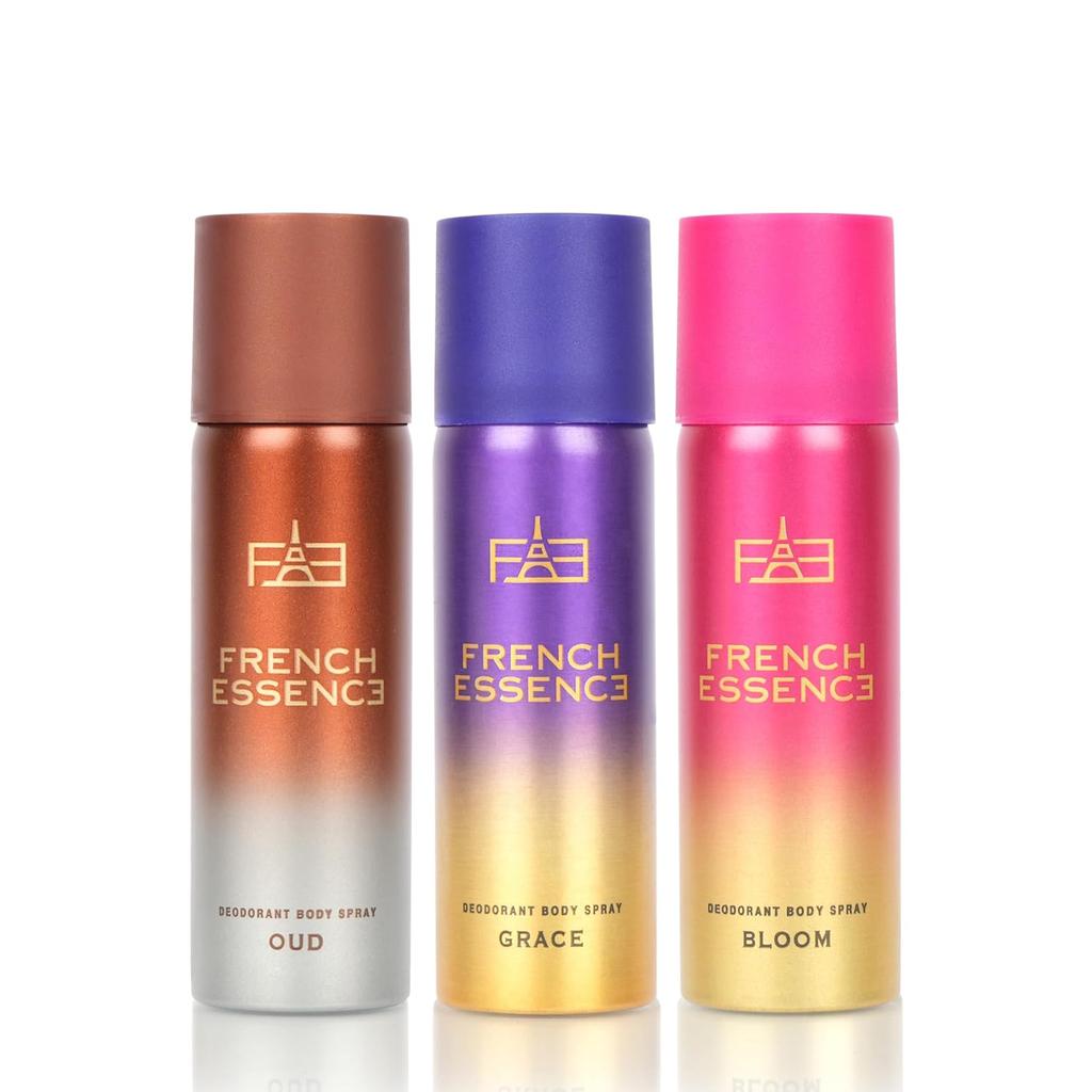 French Essence Deodorant Body Spray Combo For Women Pack Of 3 X 50ml - 1.7 Fl.oz. Each | Oud+ Grace+ Bloom Fragrance - Long Lasting Deo For Girls | Perfect For Daily Use