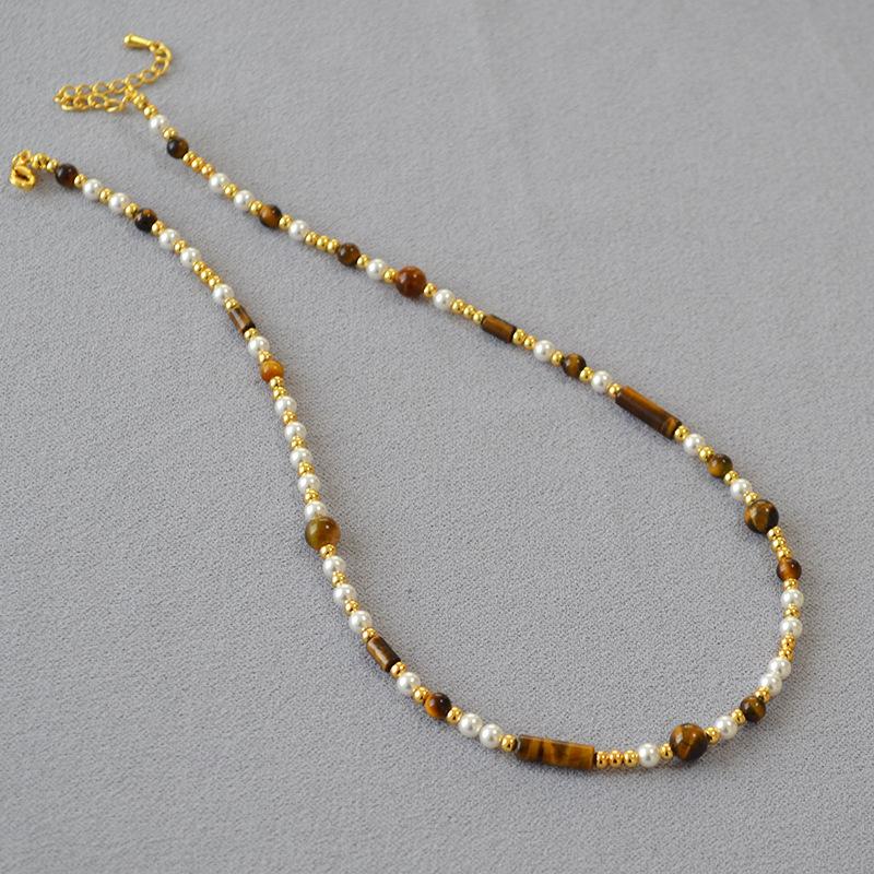 European and American niche retro Maillard wind tiger's eye stone pearl splicing beaded asymmetric necklace collarbone chain