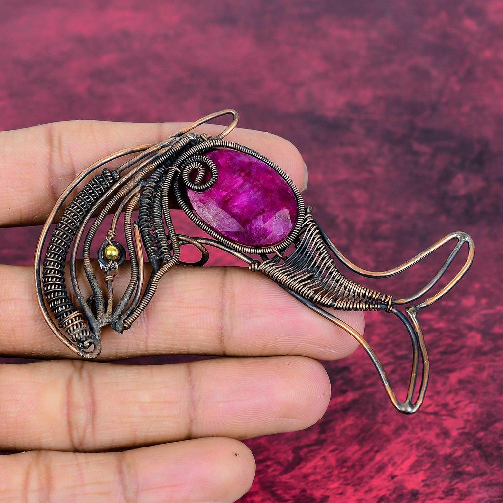 Faceted Kashmir Ruby Pendant Fish Pendant Copper Wire Wrapped Gemstone Jewelry