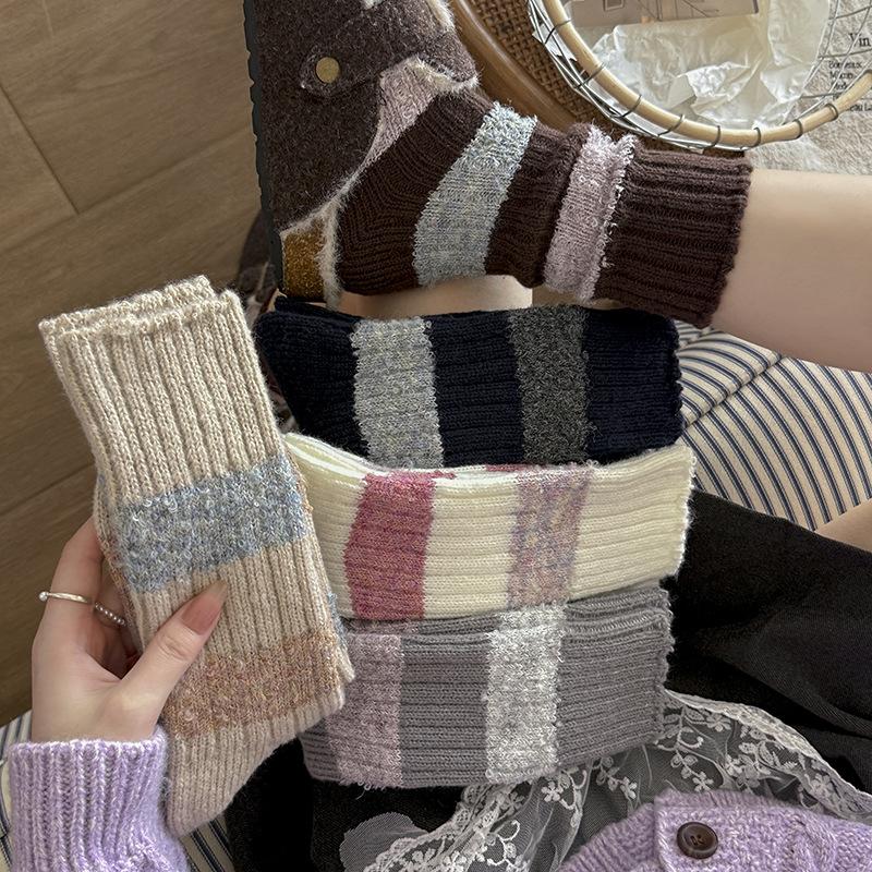 Contrasting Wool Socks Children'S Stacking Socks Seasonal Fleece Thickened Warm Color Matching Flocking Striped Cashmere Medium Tube Socks
