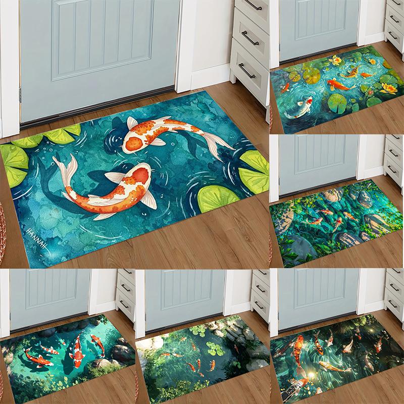 Lebhaftes Koi-Fischteich-Muster Fußmatte Realistischer Koi-Karpfen mit Lotusblättern Felsgarten-Design Fußmatte für Heim-Eingangsdekor