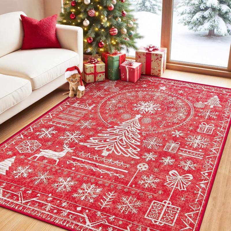 Christmas Reindeer Snowflake Red White Carpet Soft Non-slip Mat Rug for Living Room Fireplace Home Decoration Durable Easy-Clean
