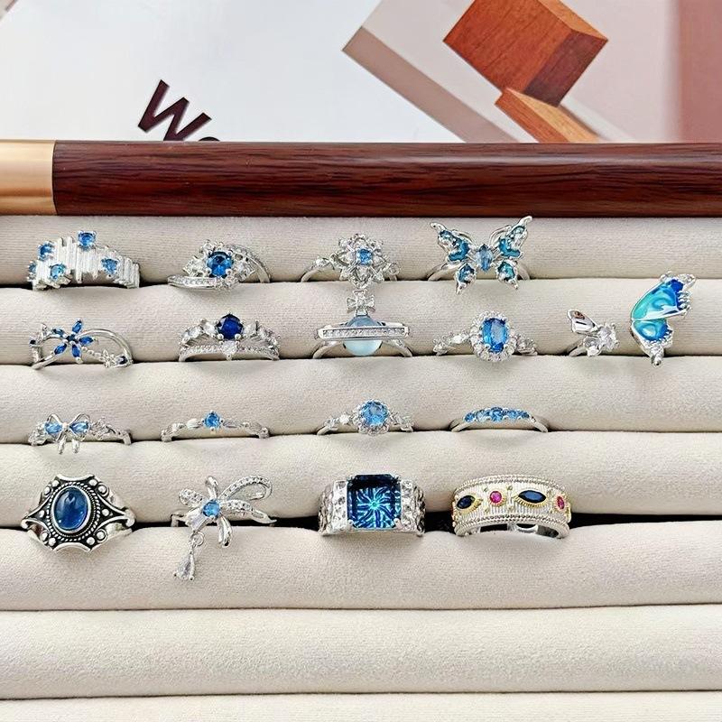 Light Luxury Full Diamond Sea Blue Zircon High-End Open Ring Gypsy Star Niche Design Butterfly Personalized Index Finger Ring Female