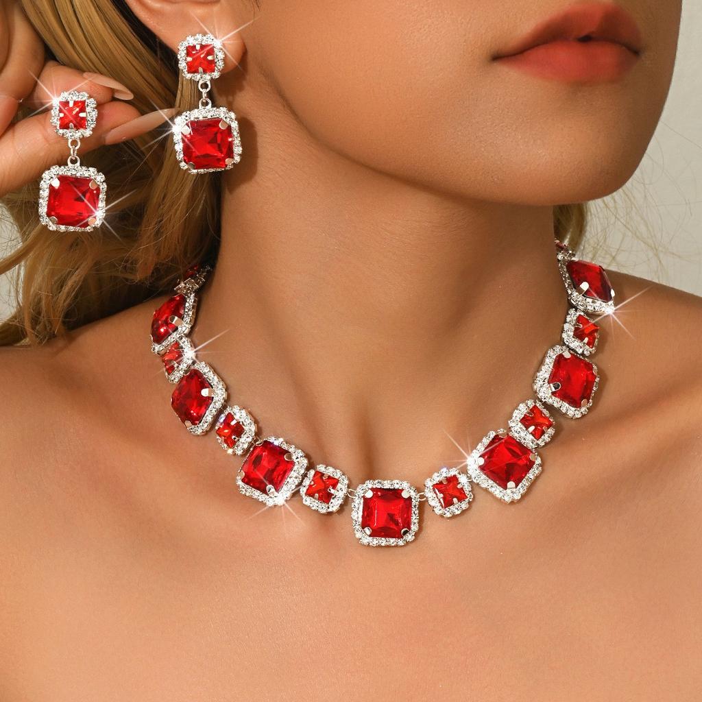 Rotes Diamant Halskette Ohrringe Set Brautschmuck Premium Quadratisches Schmuckset Schmuckset