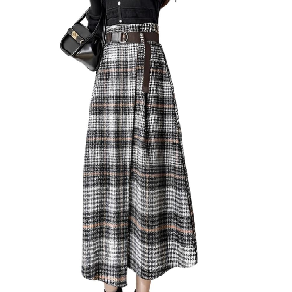 Asymmetrischer karierter Rock für Herbst und Winter [RREMN] Damen Midi-Länge Gemustert, Mit Gürtel, Dick, (Größe M, Grau)