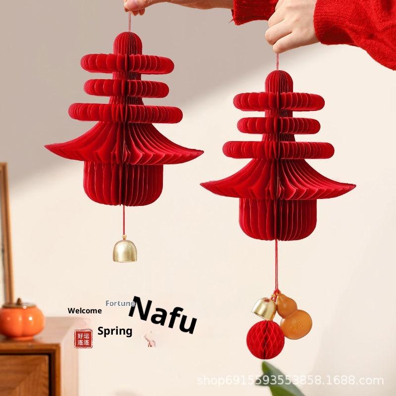 Red Paper Lanterns Xmas Navidad Ornament 2026 Christmas Tree Pendant 3D Honeycomb Hanging Decor