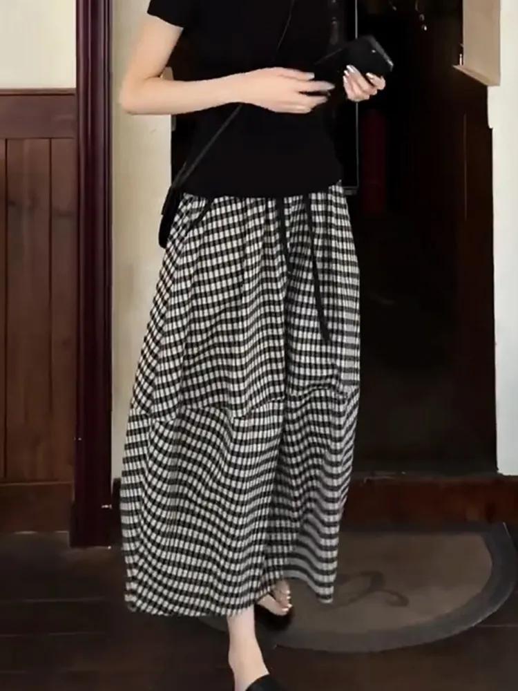 Klassischer Damen Sommer Neuer Elastischer Bund Kordelzug Knospe Temperament Karierter Rock