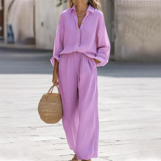 Gefertigt aus weichem, atmungsaktivem Stoff, sorgen das locker sitzende Hemd und die fließenden Hosen für ganztägigen Komfort, ohne den schicken Reiz zu beeinträchtigen.. Durchdachte Details wie ein klassisches Revers, maßgeschneiderte lange Ärmel und zulaufende oder gerade geschnittene Hosen verbessern sowohl die Passform als auch die Raffinesse.. Erhältlich in mehreren Farben, eignet sich dieses Set sowohl für professionelle Umgebungen als auch für entspannte Ausflüge und ist somit eine unverzichtbare Ergänzung für jede Garderobe.