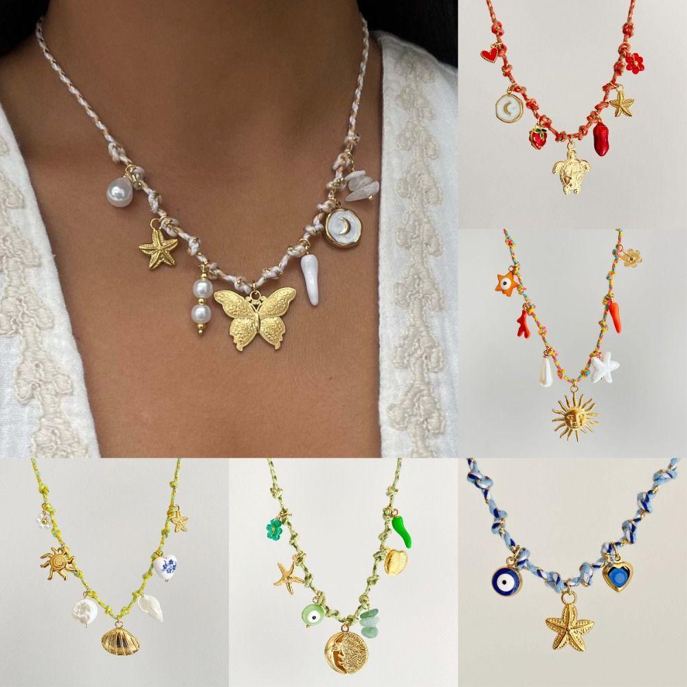 Turtle Knotting Rope Chain Necklace Boho Charm Pearl Pendant Necklace Conch Shell Necklace Gifts
