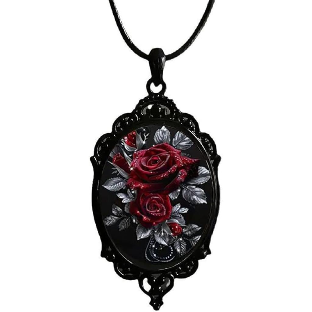 Gothic Rose Glass Necklace for Women Vintage Satan Demon Pendant Halloween Roses Necklaces Dark Punk Style Necklace Victoria Emboss Necklaces Mystic