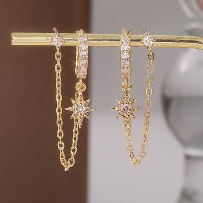Huitan 925 Sterling Kupfer Ohrstecker mit vier Zirkonia für Damen, Doppelstecker, Kette, Quaste, Piercing-Ohrring, 18K vergoldet