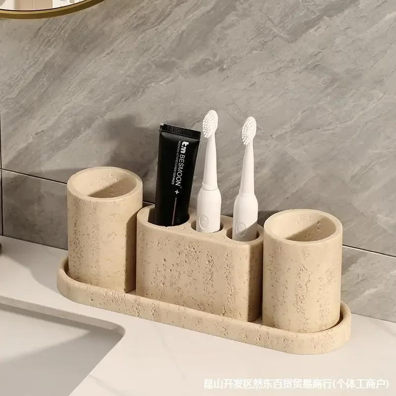 Natürlicher Marmor-Kalkstein Zahnbürstenhalter mit hellgelben Löchern Seifenspender Badezimmerablage Heimdeko Zubehör
