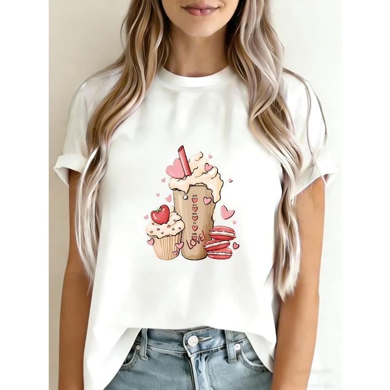 Weißes T-Shirt mit Cupcake- und Milchshake-Print für Freizeitkleidung
