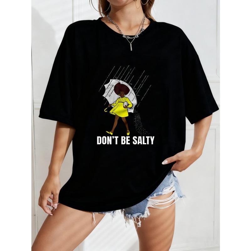 White Oversized T-Shirt With Cartoon Woman In Yellow Dress And Umbrella Don T Be Salty Print Casual Everyday Wear For Women