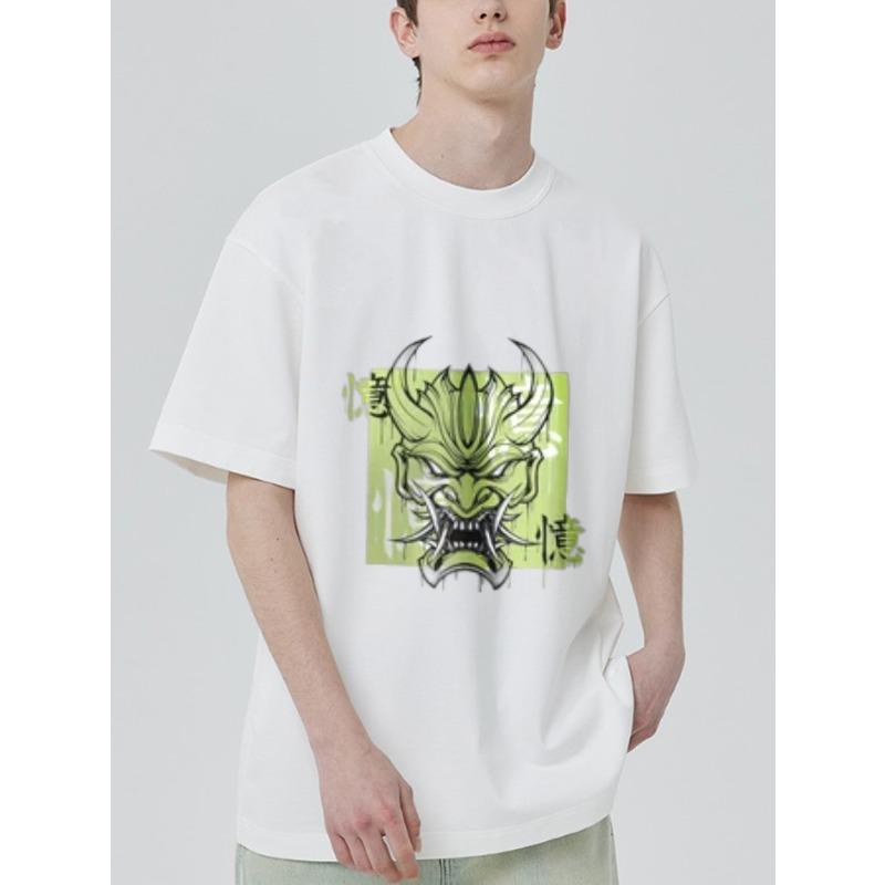 Weißes T-Shirt Herren Streetwear Grafik Drachengesicht Print Chinesische Schriftzeichen Lässig Mode Top Alltagskleidung Sommer Outfit