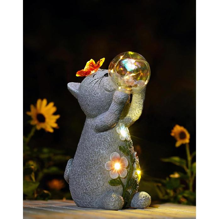 Goodeco Solar Cat Garden Statue - Outdoor Cat Decor with Solar Butterfly & Succulent Flowers LED Lights for Cat Lovers and Garden Enthusiasts - Ideal