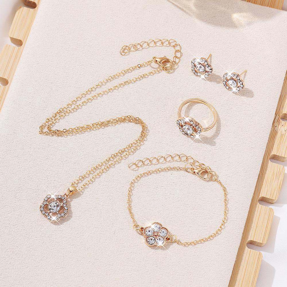 5pcs Women Zircon Set With Fashionable And Elegant Rhinestone Flower Shaped Necklace, Bracelet, Ring, and Earring Accessories,