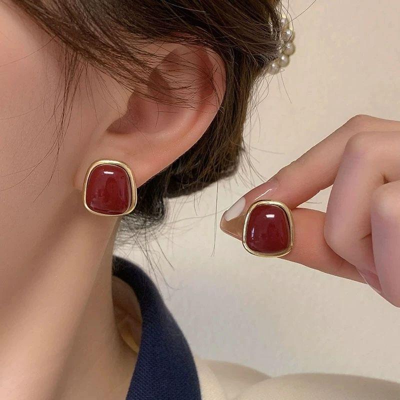 Minimalistische weinrote quadratische Ohrstecker für Damen Goldfarbener Kreis Vintage Geometrie Herz Ohrringe 2025 Neues Design Schmuck