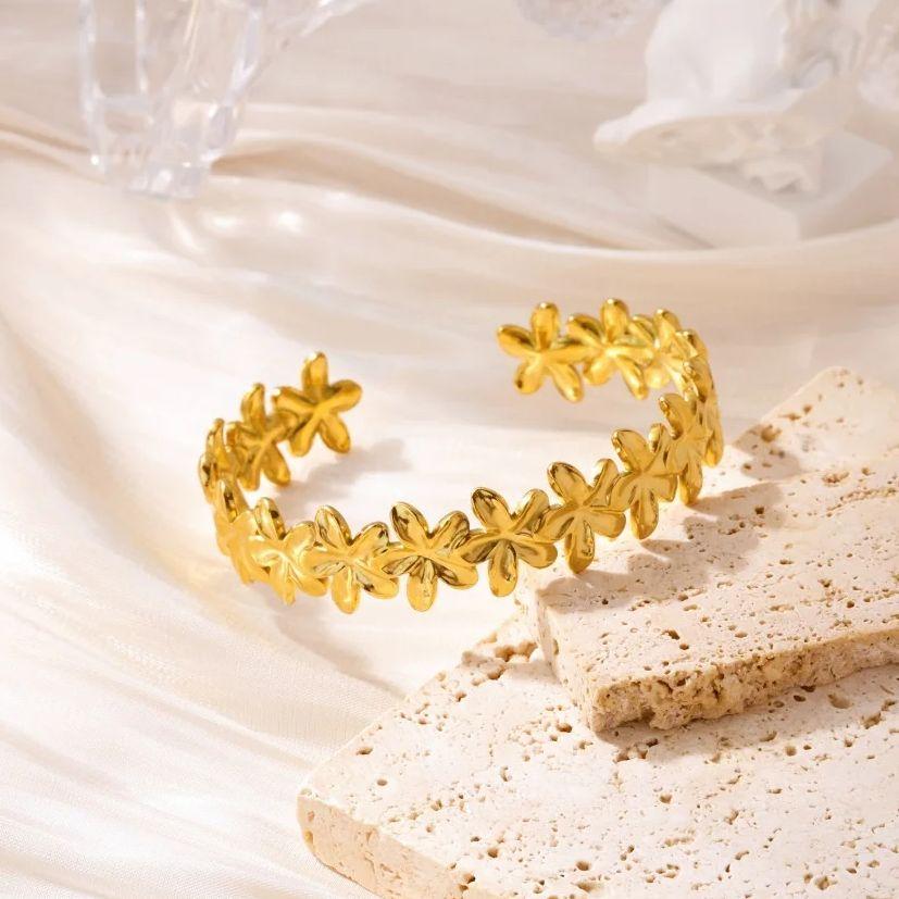 Classic Elegant Flowers Patchwork Cuff Bracelet Gold Color Stainless Steel Delicate Adjustable Open Geometric Bracelet Jewelry