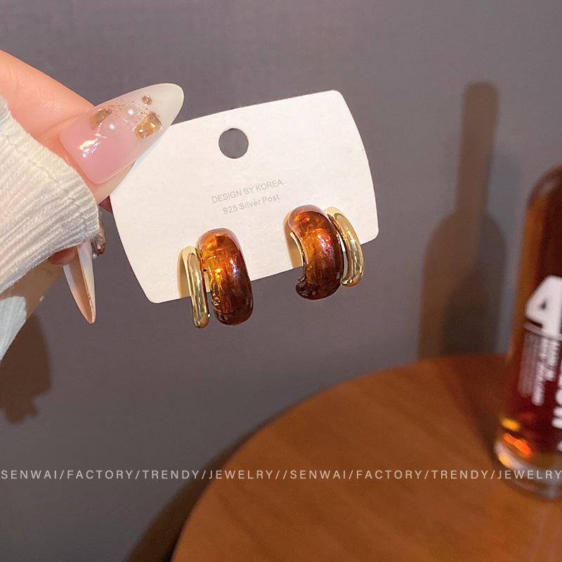 Maillard amber gold C-shaped earrings women's retro light luxury stud earrings autumn and winter ear jewelry