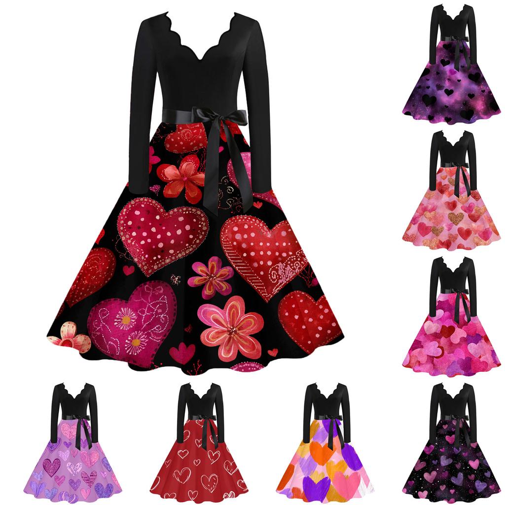 Damen Casual Mode V-Ausschnitt Valentinstag Print Retro Kleid