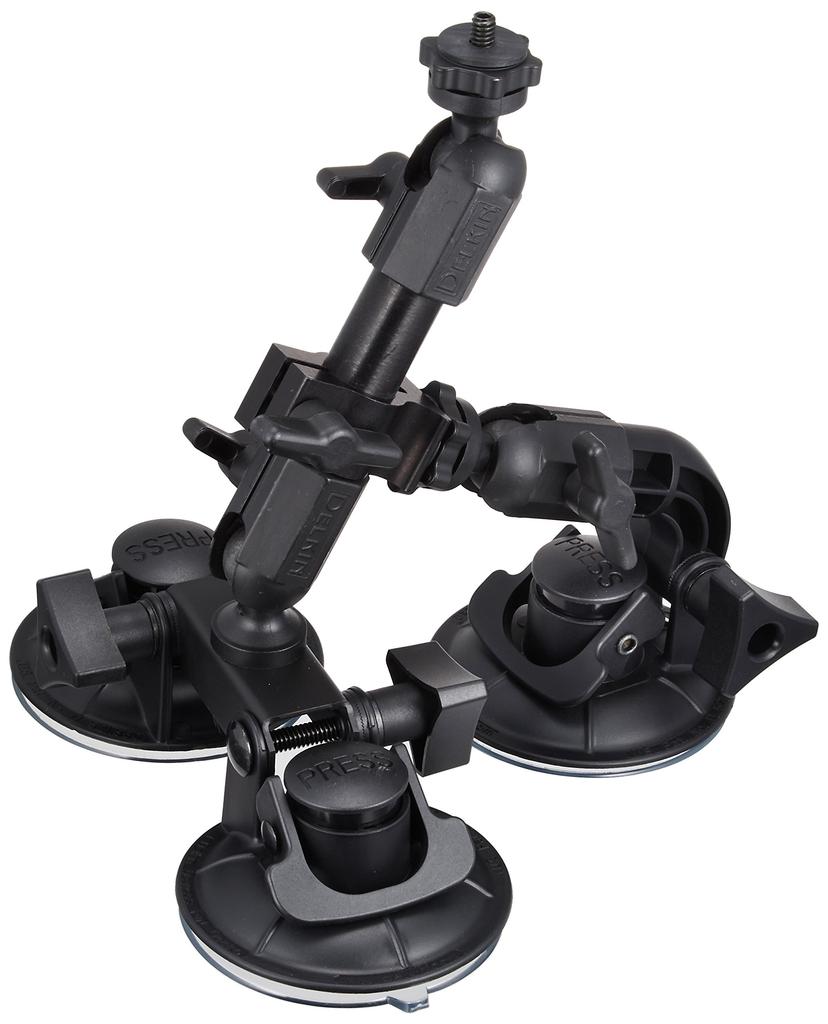 The "Three-Point Suction Cup Camera Mount" includes the FatGecko Dual Suction Cup Camera Mount (DDFG-SCTN), the FatGecko Mini Single Suction Cup Camera Mount (DDFG-MINI), and the three-point connector bracket (DDMOUNT-AC-ARM). It comes pre-assembled and ready to use.
