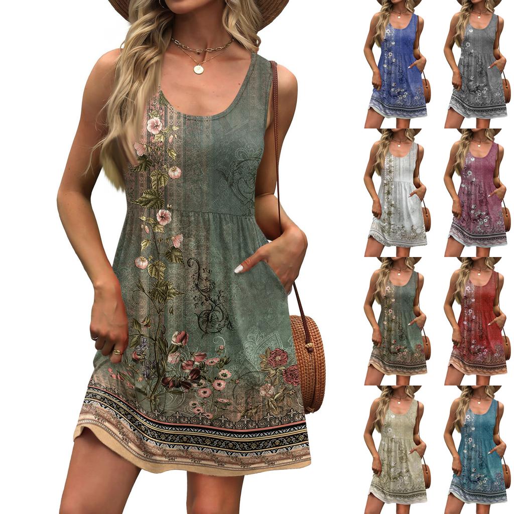 Damen Sommerkleid A-Linie Ärmellos Lässig Sonnenkleid Mit Taschen