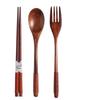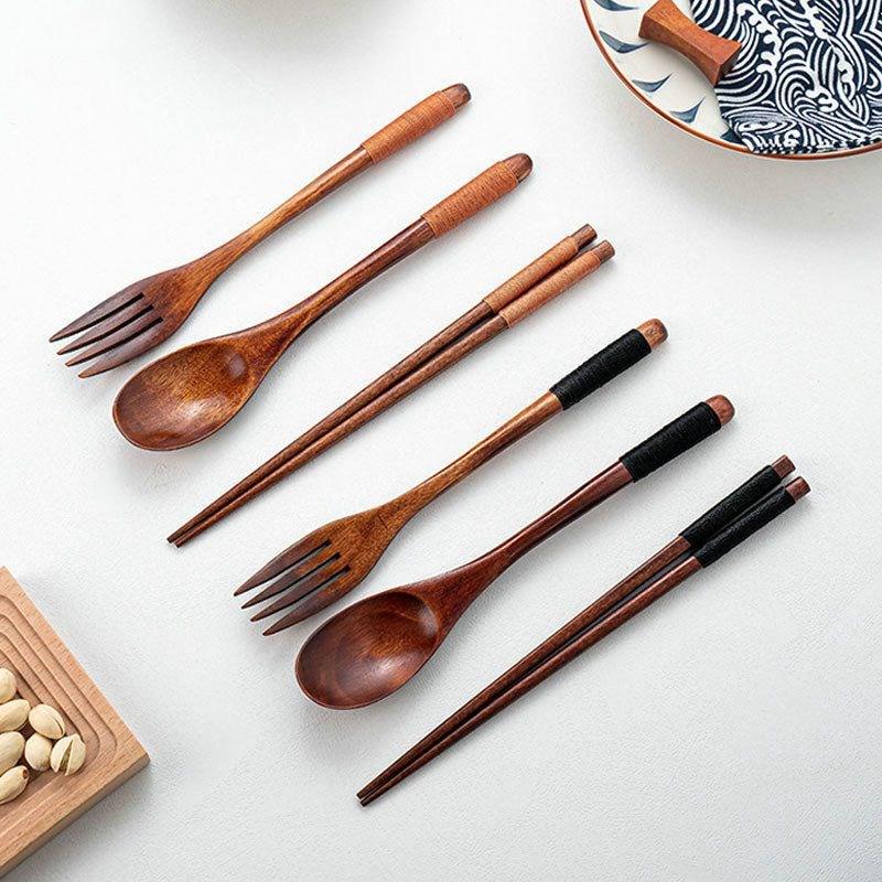 Studentisches Holzbesteck-Set: Löffel, Gabel, Essstäbchen mit Tragetasche. Ideal für den Außenbereich.