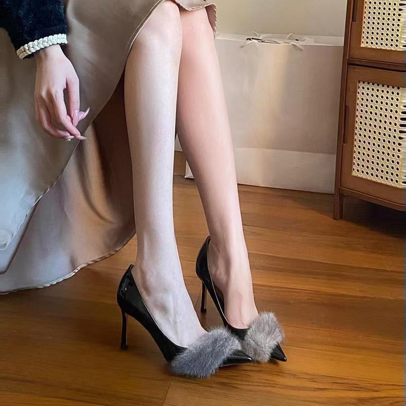 Schwarze flauschige High Heels Damen Saison Spitze Sexy Königliche Schwester Temperament Dünne Absätze Nicht müde Füße Einzelne Schuhe