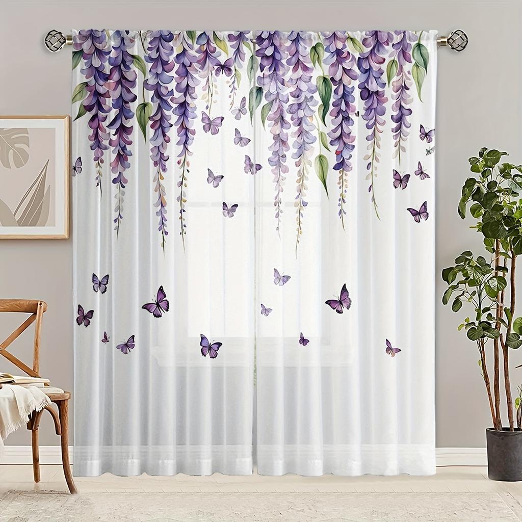 2 Pcs Luxe Sheer Wisteria Floral Curtains – Romantic Art Theme Rod Pocket Design for Bedroom Decor