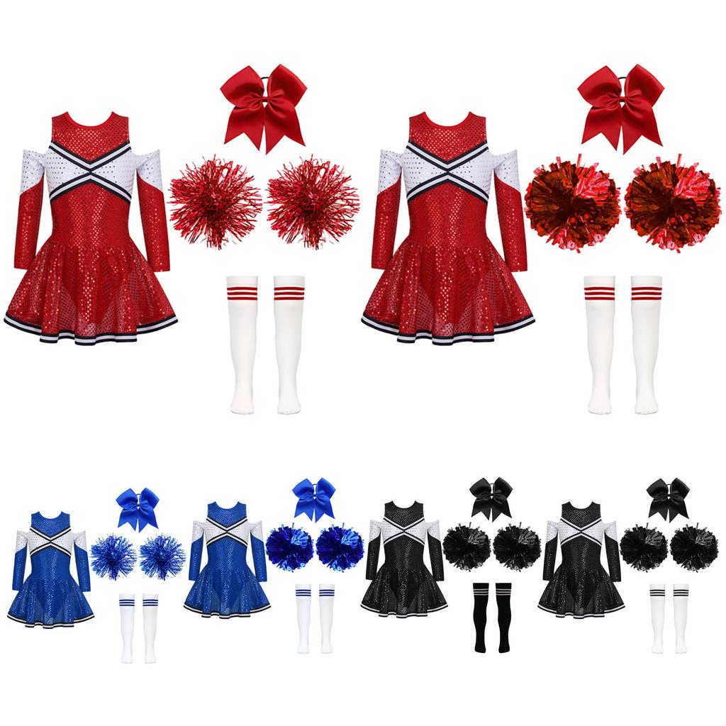 Mädchen Glitzerndes Cheerleading-Outfit Schulterfrei Paillettenkleid Langarm Schleifen-Kopfschmuck Handaccessoires Sportsocken