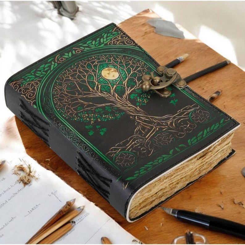 Handmade Leather Journal: Tree of Life Grimoire with Antique Lock