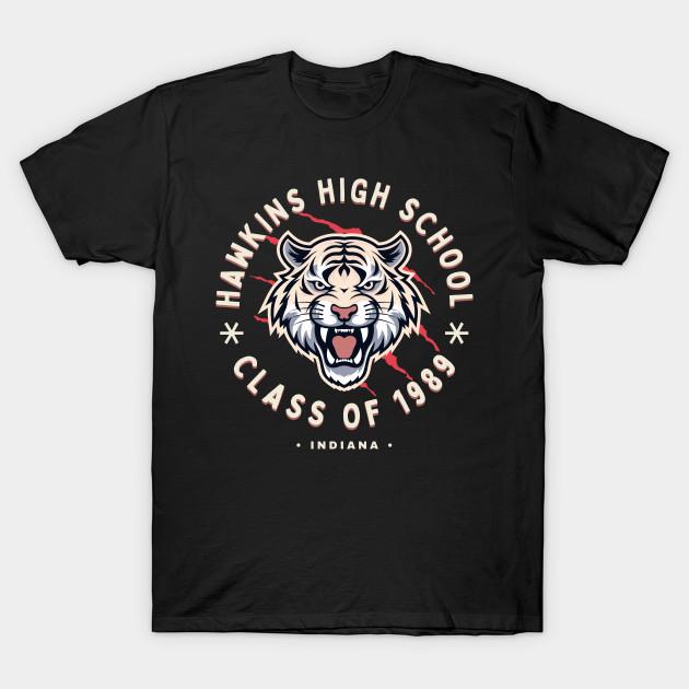 Herren Schwarzes Print-T-Shirt Hawkins High School Tigers 1989 Abschluss Retro No-Cut Transferpapier Druck Baumwoll-T-Shirt