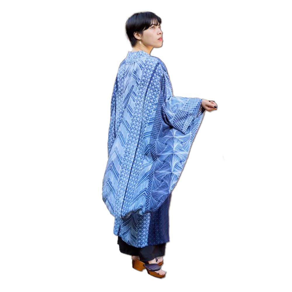 Product Specifications: This furisode haori (long-sleeved kimono) is made of lightweight rayon fabric for a refreshing and comfortable look. Each piece is hand-dyed by artisans using the shibori dyeing technique. Pair it with a dress for a sophisticated Japanese look. Shibori dyeing involves folding the fabric, sewing the pattern, dyeing it, and then undoing the thread, revealing the white lines. The delicate pattern, revealed through the shading of the dye, is captivatingly beautiful. Size: Length 98cm, Shoulder Width 125cm, Bust 120cm, Sleeve Length 67cm. Material: 100% rayon. Note: This item is handcrafted by artisans. Due to the cutting method of the fabric, variations in pattern placement, shape, and color may occur on each item. Products sold online are shared with our physical store inventory. Depending on your computer or smartphone monitor settings, the actual color of the product may differ from what you see on your screen.
