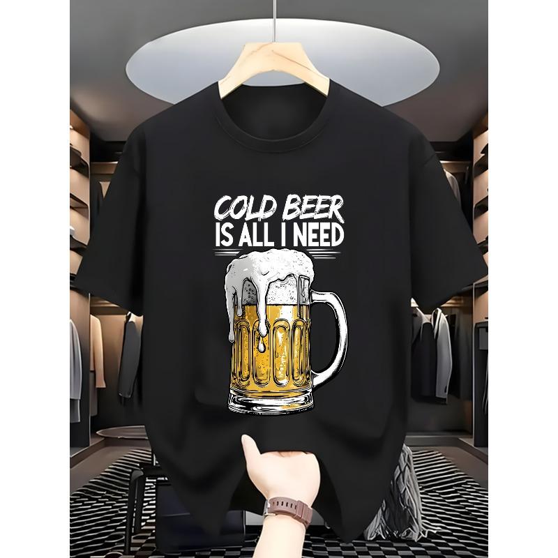 Europäische Größen Herren Leichtes Atmungsaktives Polyester Kurzarm-T-Shirt mit Bierkrug-Grafikdruck - Lässiges Rundhals-T-Shirt für Reisen, Sommer
