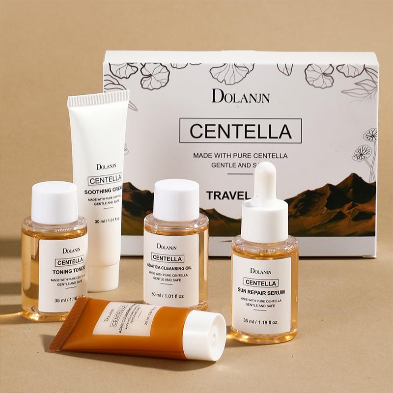 DOLANJN 5-teiliges Hautpflege-Set Centellasun: Sonnenschutz-Reparaturserum, Tonisierendes Gesichtswasser, Asiatica Reinigungsöl, Akne-Reinigungsschaum & Beruhigende Creme