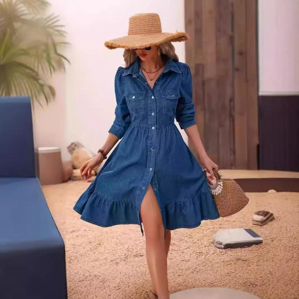 Mode Rüschen Damen Blaues Jeanskleid Elegant Knopfhemd Midi-Kleid Weiblich Frühling Sommer Freizeitkleider Robe Femme