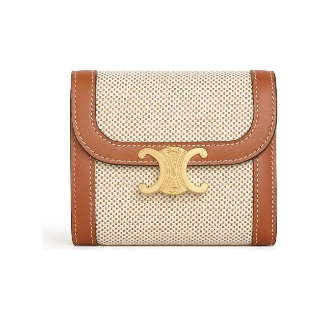 CELINE Triomphe Gold Buckle Foldover Canvas and Leather Wallet for Women Beige/Brown