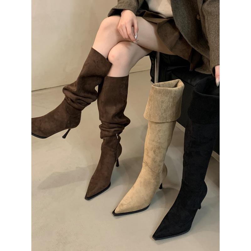 Zwei over-the-knee Stiefel Tragen großen Schaftumfang breiter Schaft Wildleder Spitze dünner Absatz hoher Absatz Faltenstiefel Gestapelte Stiefel