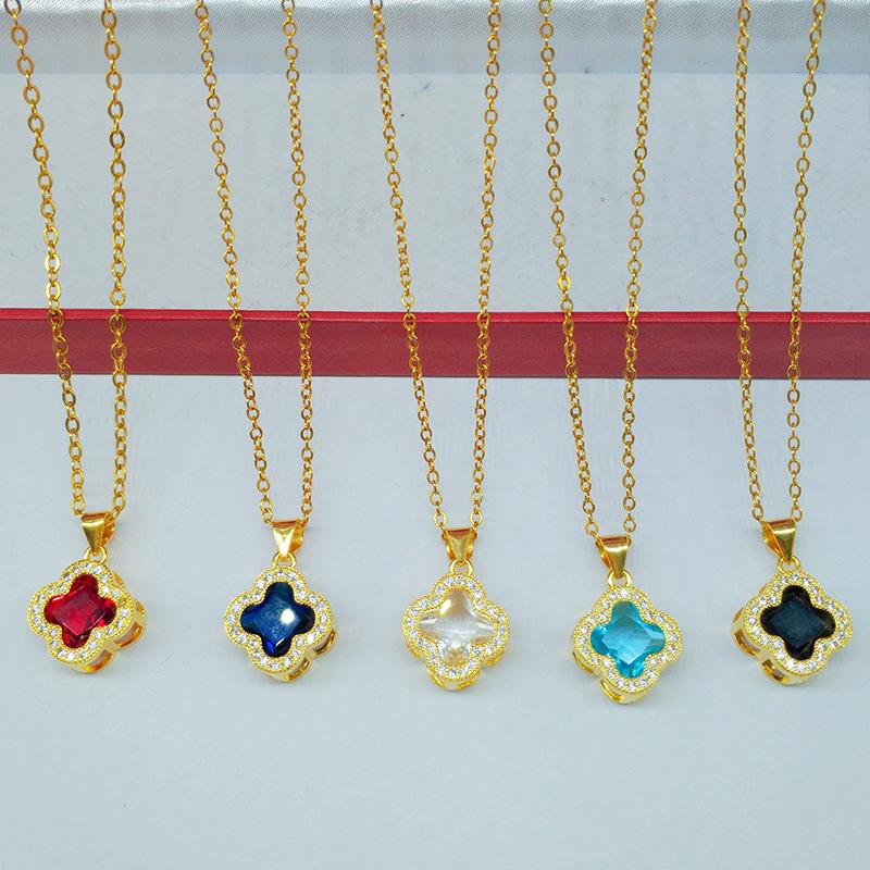 Kupfer Vergoldete Mehrfarbige Strassstein Vierblättrige Kleeblatt Halskette für Damen