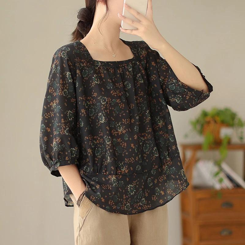 Summer New Style All-match Vintage Style Temperament Summer Seven-inch Sleeve Shirt Round Neck Button Floral Refreshing Top
