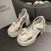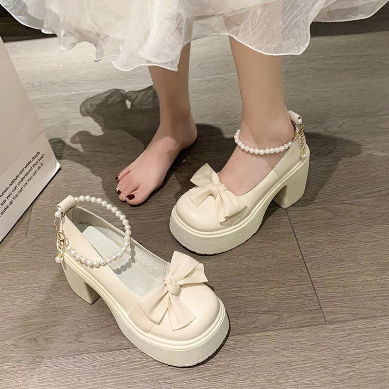 Damen Plateau Mary Jane Schuhe mit Perlenriemen Schleife Klobiger Absatz Lolita Schuhe