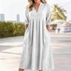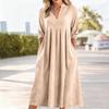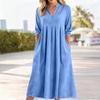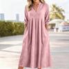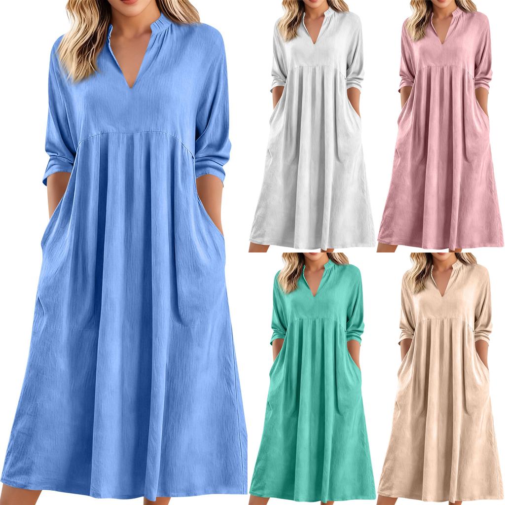 Modisches Damen Farb-V-Ausschnitt Lässiges Lockeres Retro Baumwoll-Leinen Langarm Tasche Kleid