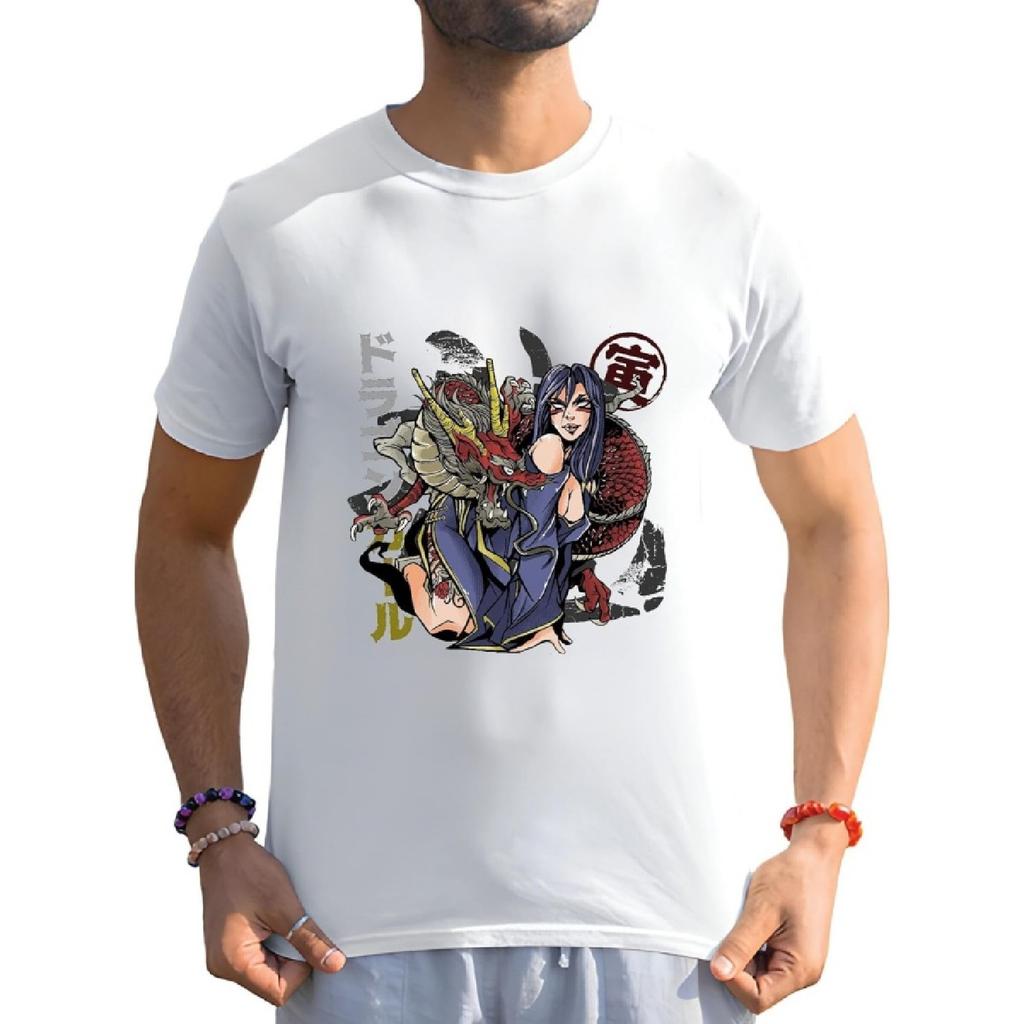 Geschenk Anime Fans Frau mit japanischem Drachen Hintergrund Mythische Kreaturen Männer Frauen Weiß Grau Mehrfarbig T-Shirt