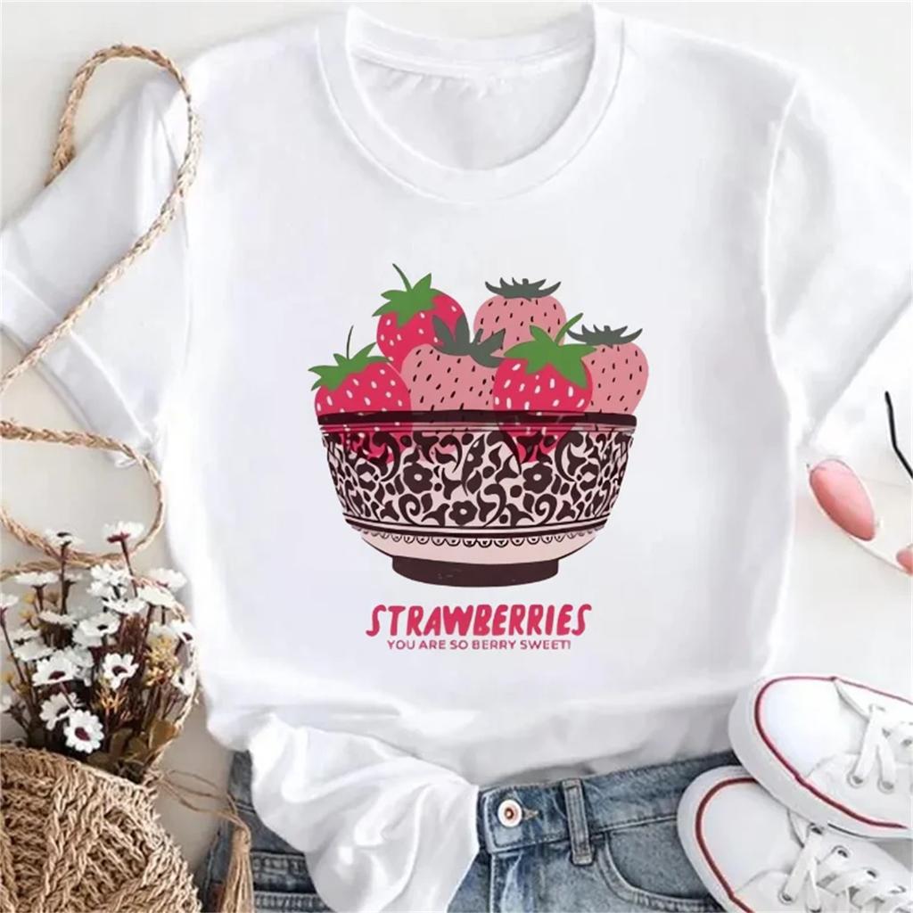 Cute Beach Travel Style 90s Fruit Strawberry Pattern Women's Top Fashionable Print O-Neck Summer Short Sleeved New Women's T-Shi