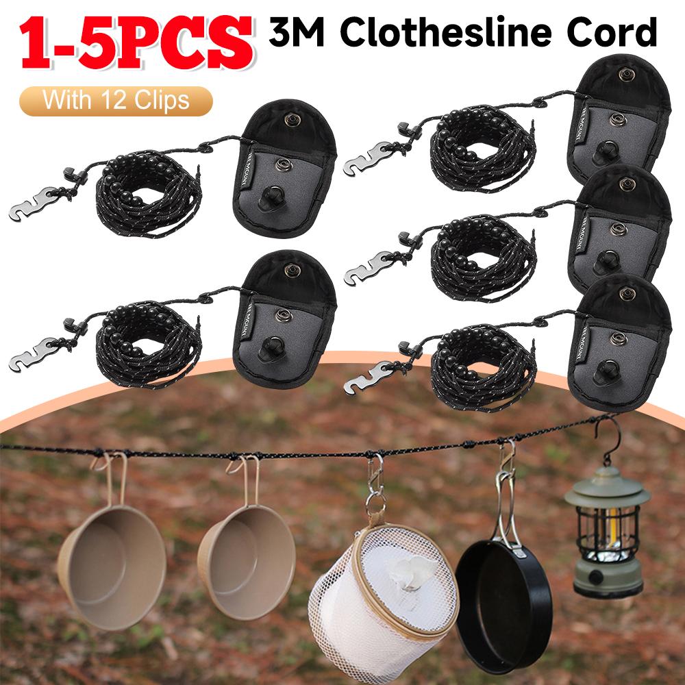 1-5PCS Portable 3-Meter Beaded Clothesline With 12 Clips Adjustable Windproof Outdoor Laundry Line for Camping & Travel