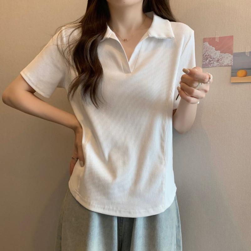 Damen Weiß Geripptes Poloshirt Kurzarm Schmal Geschnitten Lässig V-Ausschnitt Tägliches Oberteil