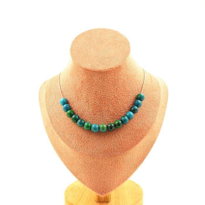 Pierres et Minéraux. Collier 15 perles Chrysocolle Teintée 8 mm. Chaine en acier inoxydable Collier femmes, hommes. Taille personna